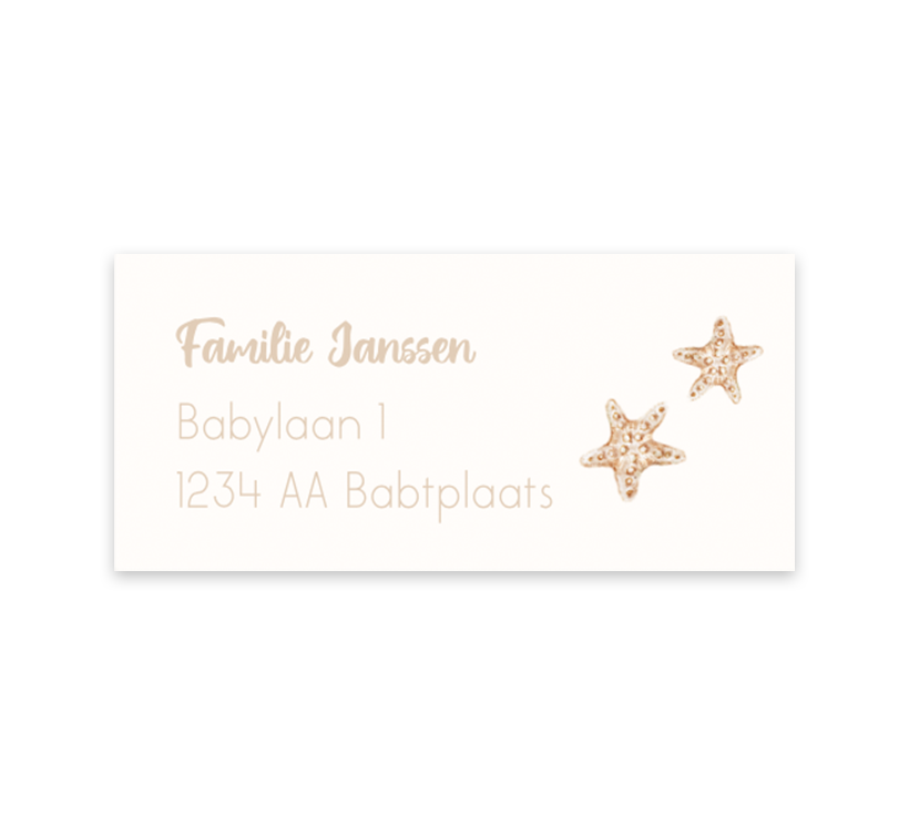 Deze lieve adressticker past perfect bij jullie geboortekaartje met zeedieren. De stickers zijn voorzien van een crème kleurige achtergrond. Op de sticker zie je twee getekende zeesterren. In onze online editor kan op iedere sticker een ander adres ingevuld worden. Ieder vel bevat twaalf adresstickers.