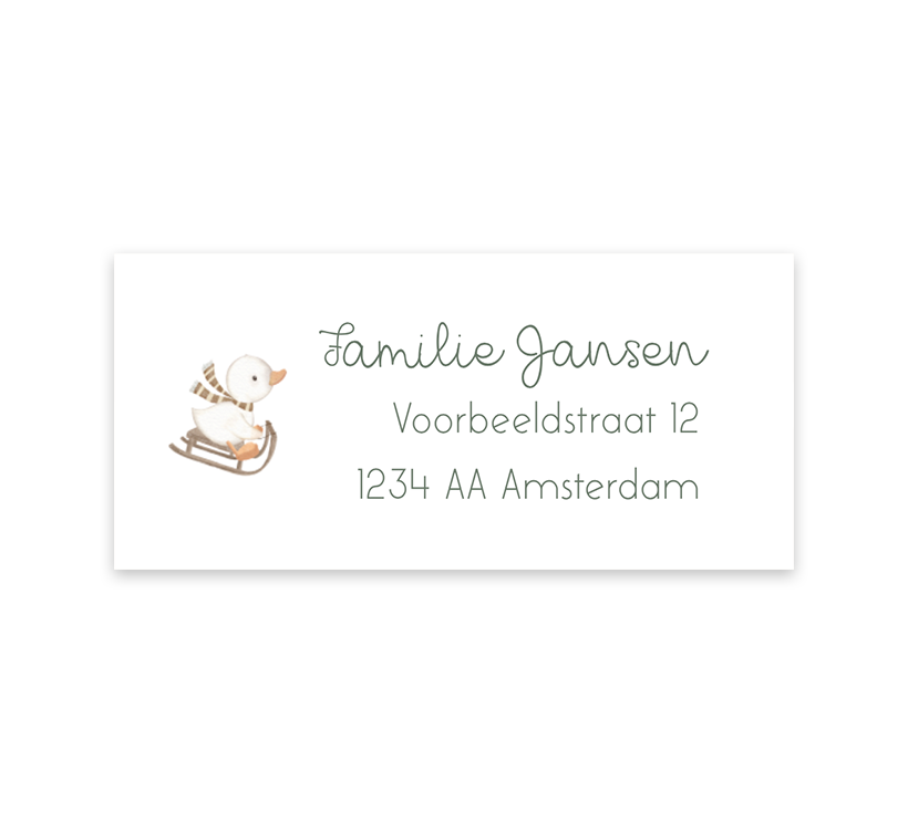 Een vrolijke adressticker voor jouw kindje. De sticker heeft een witte achtergrond met daarop een sleeënd eendje. Op elk vel zitten 12 adresstickers. Pas de sticker naar wens aan in onze online editor.