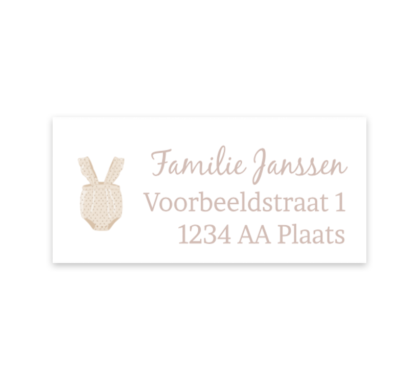 Handige bijpassende adresstickers bij het geboortekaartje met waslijn en kleertjes meisje. De sticker heeft een witte achtergrond met daarop een lieve illustratie van een babypakje. Pas de adressen eenvoudig aan in de online editor, er staat 12 stickers op een vel.