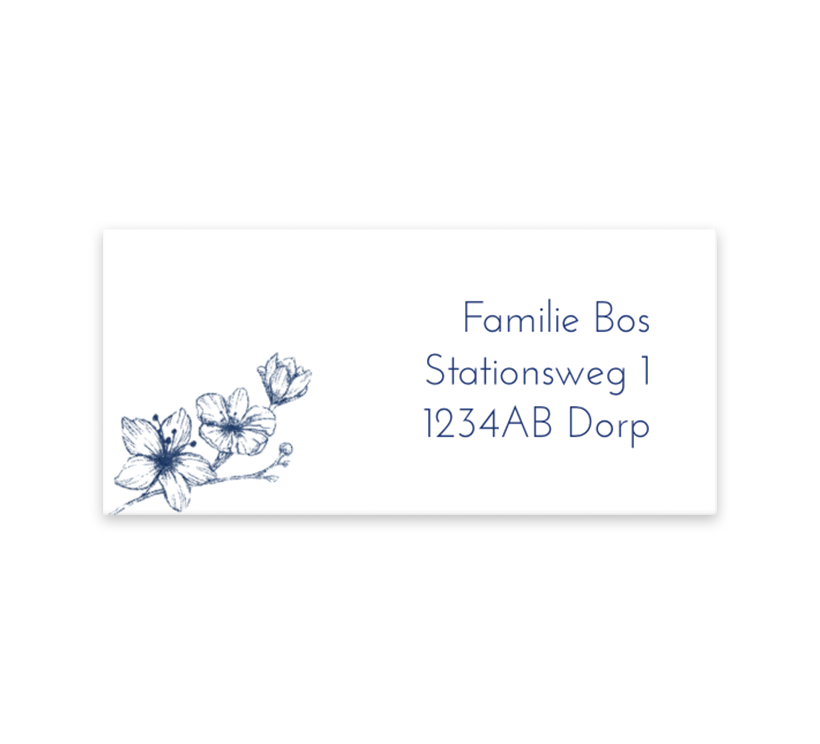 Adressticker wit met blauwe lijntekening bloem