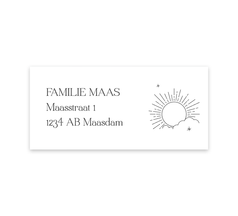 Deze adresstickers zijn geheel zelf te ontwerpen! De sticker heeft een witte achtergrond met daarop een lijntekening van een zon en wolkjes. Pas het ontwerp naar wens zelf aan. Ieder vel bevat twaalf adresstickers.