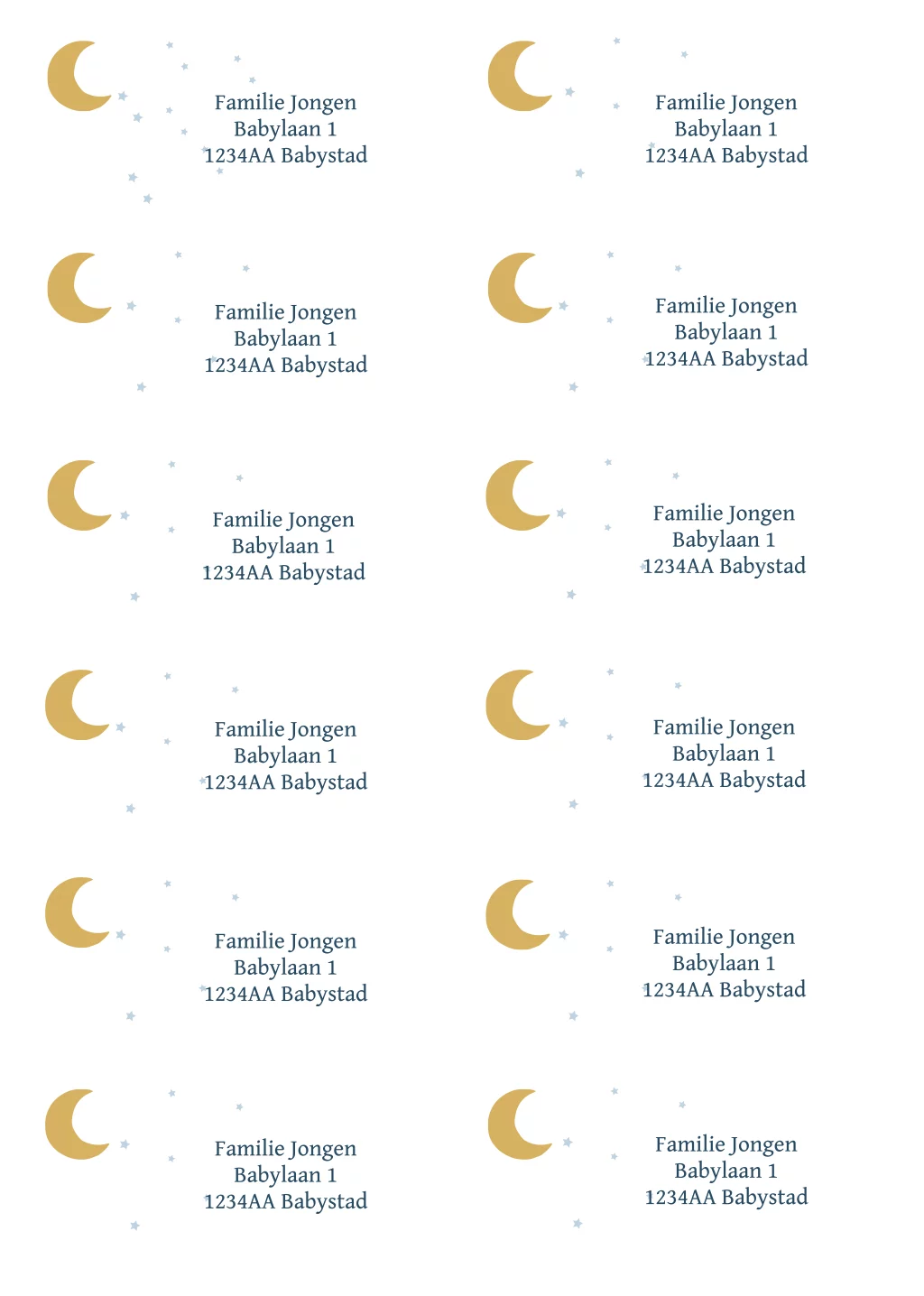 Een stijlvolle adressticker passend bij het geboortekaartje. Pas de sticker gemakkelijk aan in onze online editor. Ieder vel bevat 12 stickers.