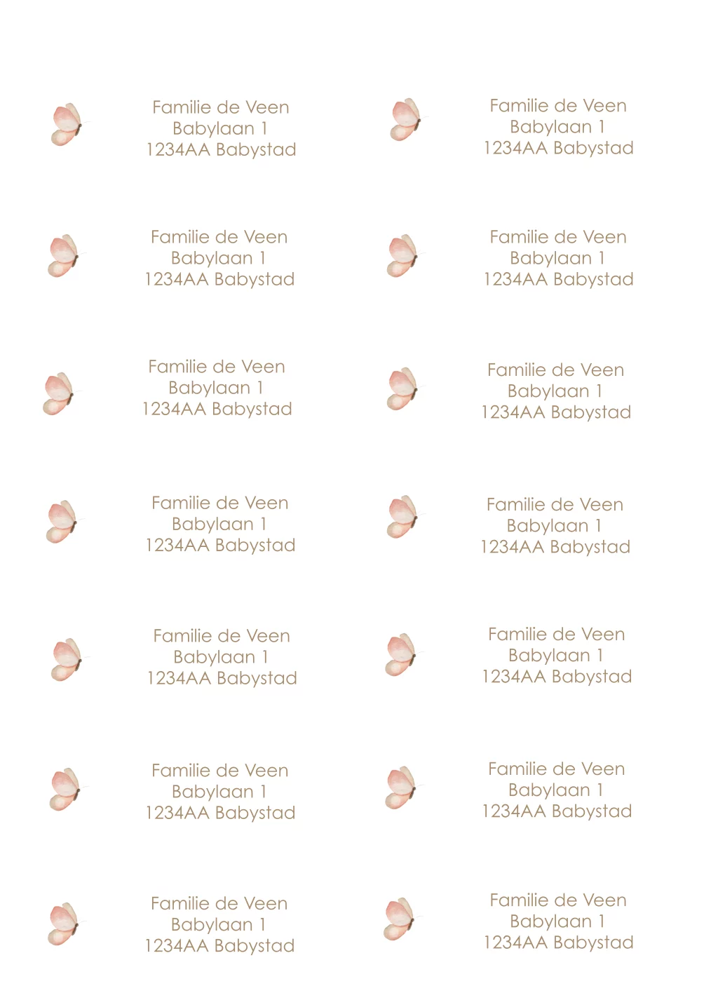 Een schattige adressticker passend bij het het geboortekaartje. De adressticker heeft een witte achtergrond met daarop een illustratie van een vlinder. Pas het ontwerp naar wens aan in onze online editor.