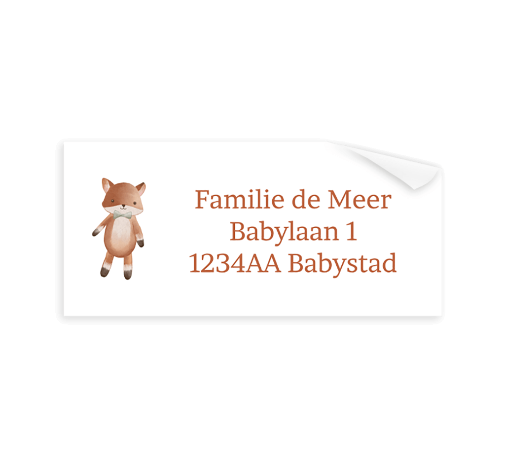 Een schattige adressticker voor bij het geboortekaartje van jouw zoon. De sticker heeft een illustratie van een knuffel vosje. Pas het ontwerp naar wens aan in onze online editor.