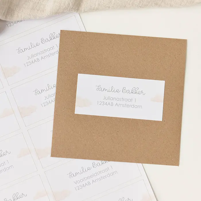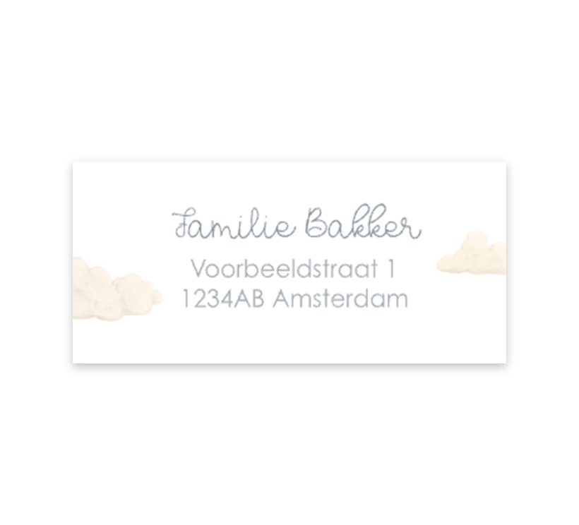 Een lieve bijpassende adressticker bij het geboortekaartje van jouw kindje. Deze sticker heeft een witte achtergrond met daarop lieve wolkjes. Pas de adressen zelf gemakkelijk aan. Elk vel heeft 12 adresstickers.