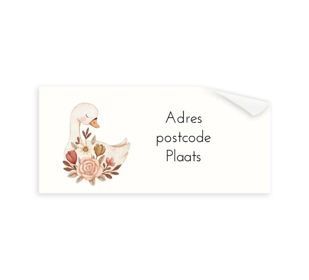 Deze adresstickers heeft een illustratie van een zwaantje met bloemen In onze online editor kan op iedere sticker een ander adres ingevuld worden. Liever zonder bloemen of het baby zwaantje? Ook dat kan in de editor aangepast worden. Ieder vel bevat twaalf adresstickers.