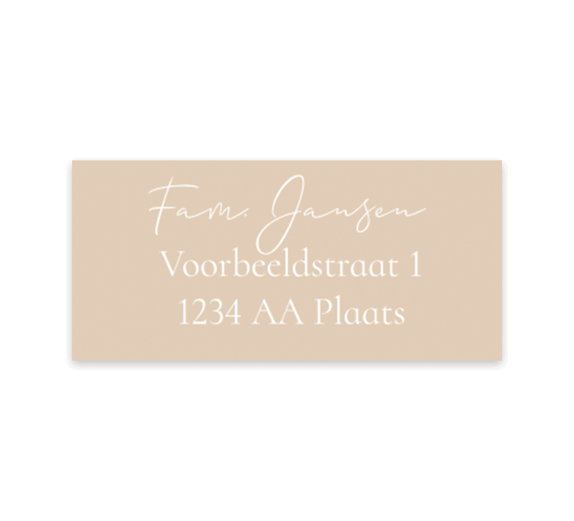 Bijpassende adresstickers bij het geboortekaartje van jouw kindje. Deze sticker heeft een beige achtergrond met sierlijk lettertype. Pas de adressen zelf gemakkelijk aan.