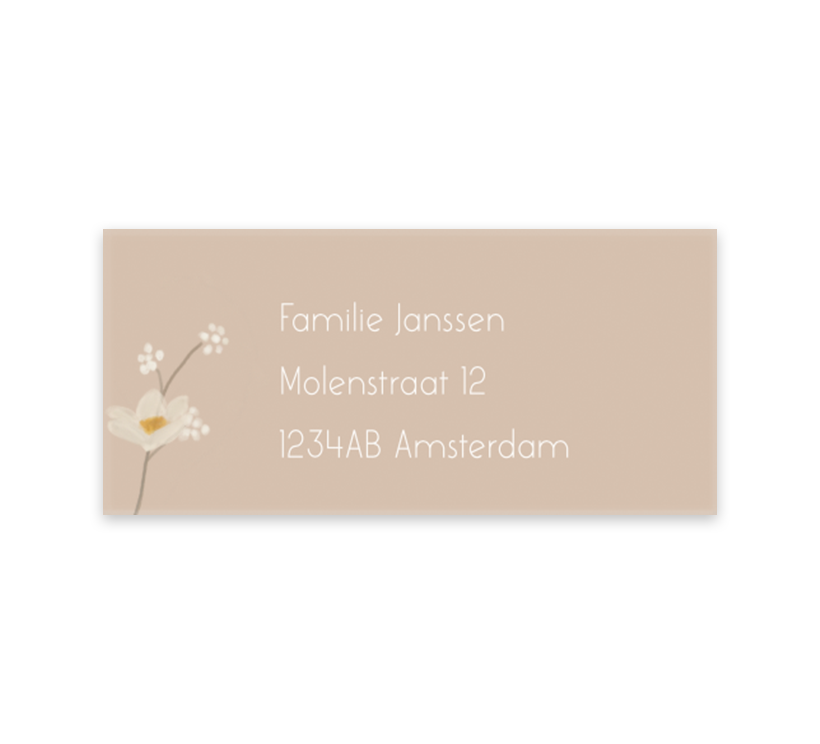 Stijvolle adresstickers met een beige achtergrond. Naast de adressen staan lieve bloemetjes. Pas de adressen en het ontwerp naar wens aan in onze online editor en bestel de adresstickers voor jouw geboorteaankondiging.
