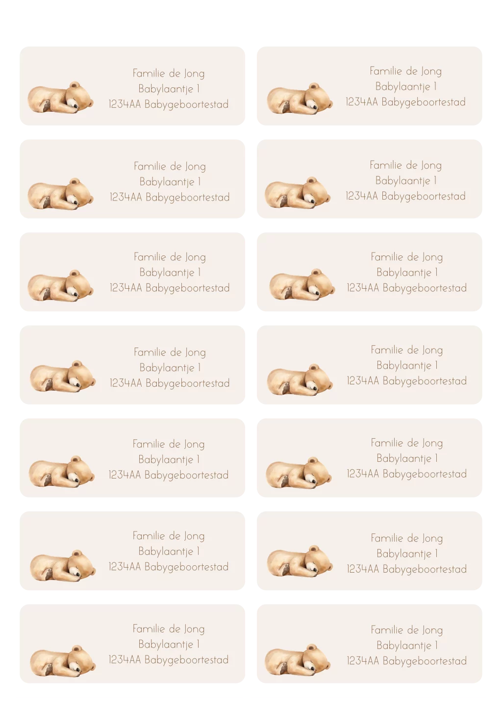 Een lieve adressticker passend bij het geboortekaartje voor jouw kindje. De sticker heeft een beige achtergrond met ronde hoeken. Je ziet een schattige illustratie van een slapend beertje op dekentjes. Pas het ontwerp naar wens aan in onze editor.