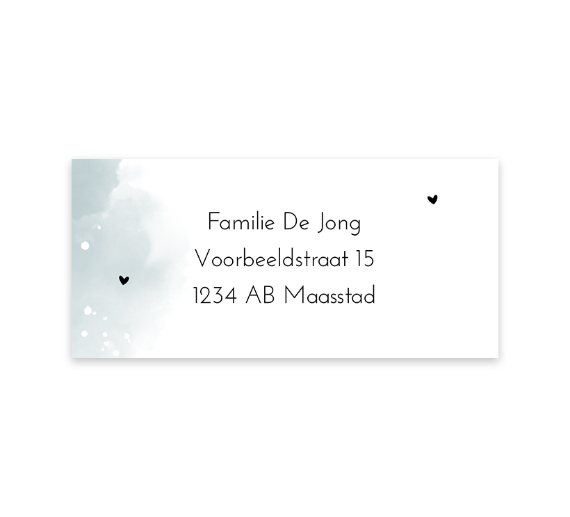 Witte adresstickers met een vlak lichtblauwe aquarel met witte spetters naast het adres. Naast de tekst twee hartjes in zwart, in de online editor pas je de tekst eenvoudig aan, per vel kun je 12 adressen invoeren.