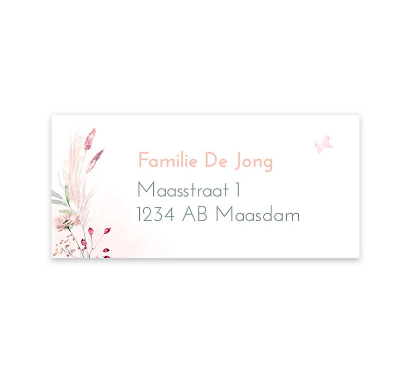 Mooie bijpassende adresstickers met een toef bloemen langs het adres en een klein vlindertje in de hoek, de achtergrond is wit met roze aquarel. In de editor kun je de adressen invoeren, er is plaats voor 12 adressen per vel.