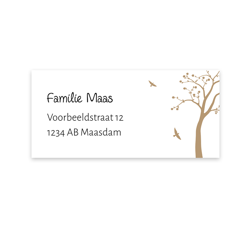 Deze adresstickers passen perfect bij het geboortekaartje met broer en zus op de tractor. Naast de adressen staat het silhouet van een boom met twee vliegende vogels. Per vel kunnen er 12 adressen worden ingevoerd in de online editor.