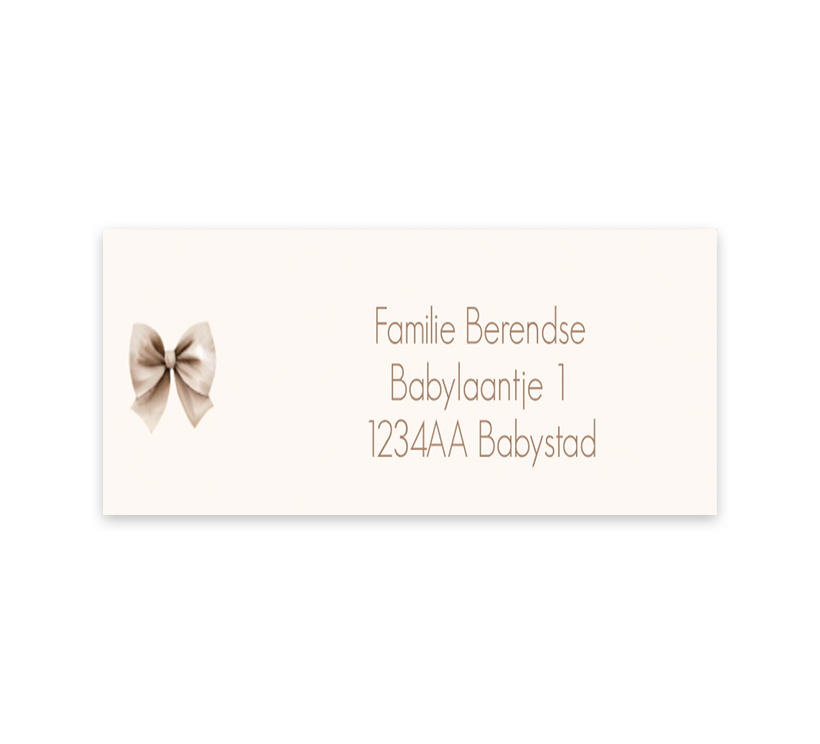Wat een lieve adressticker voor op de envelop. Het ontwerp heeft een lichte achtergrond met daarop kleine bruine strikjes. Pas het ontwerp naar wens aan in onze online editor.