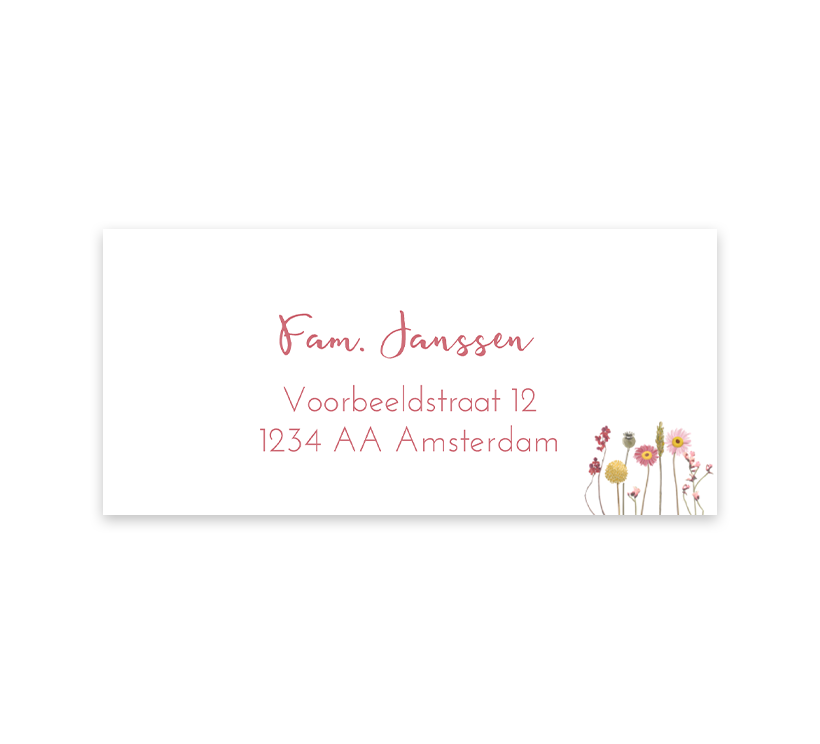 Handige adresstickers die perfect bij het geboortekaartje met de droogbloemen past, in de hoek komt het bloemendesign weer terug. De adressen zijn in roze tekst en kunnen worden aangepast in de online editor, per vel kunnen 12 adressen worden ingevoerd.