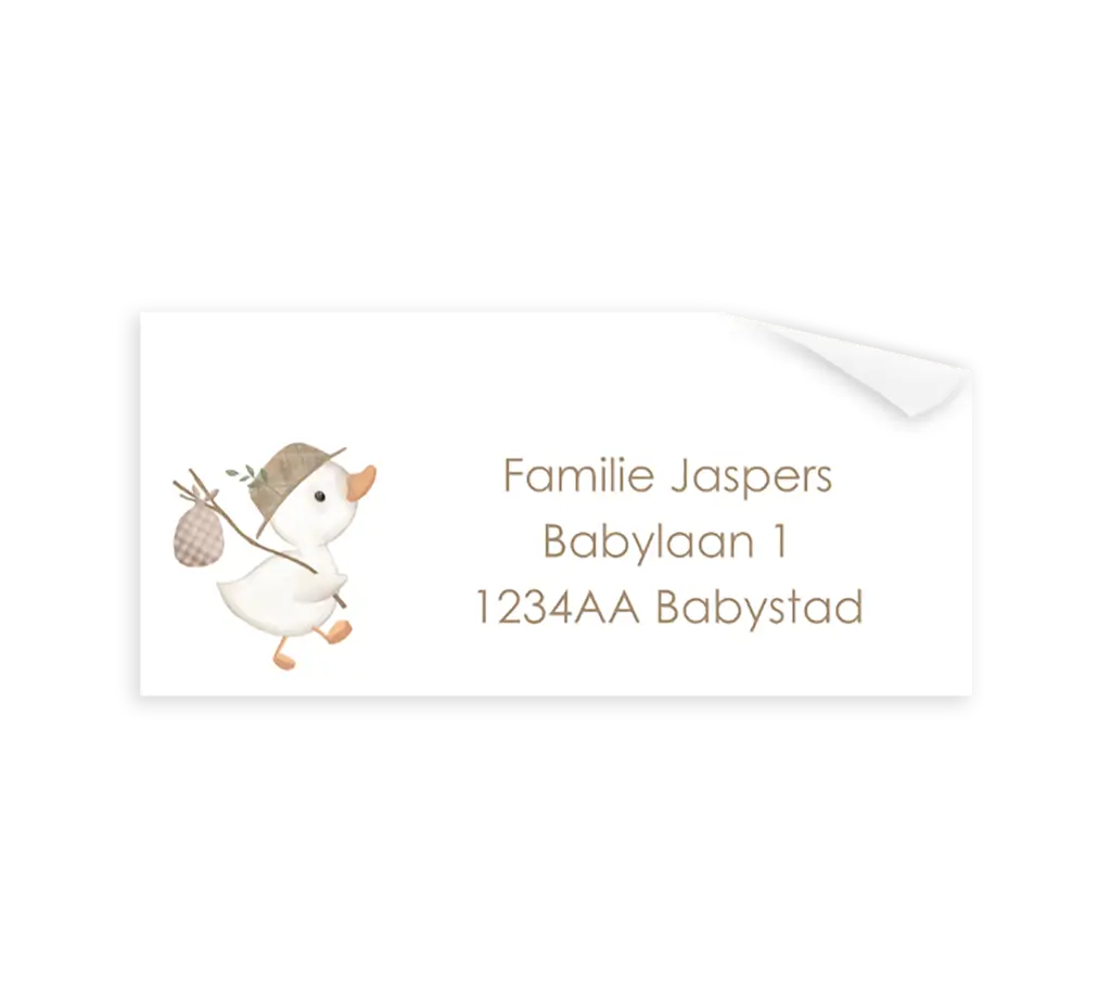 Deze schattige adresstickers met een lief eendje en knapzak zijn de perfecte extra touch om het versturen van jullie geboortekaartje extra persoonlijk te maken. In onze online editor kan op iedere sticker een ander adres ingevuld worden. Ook kan het design van de stickers helemaal aangepast worden naar eigen wens.