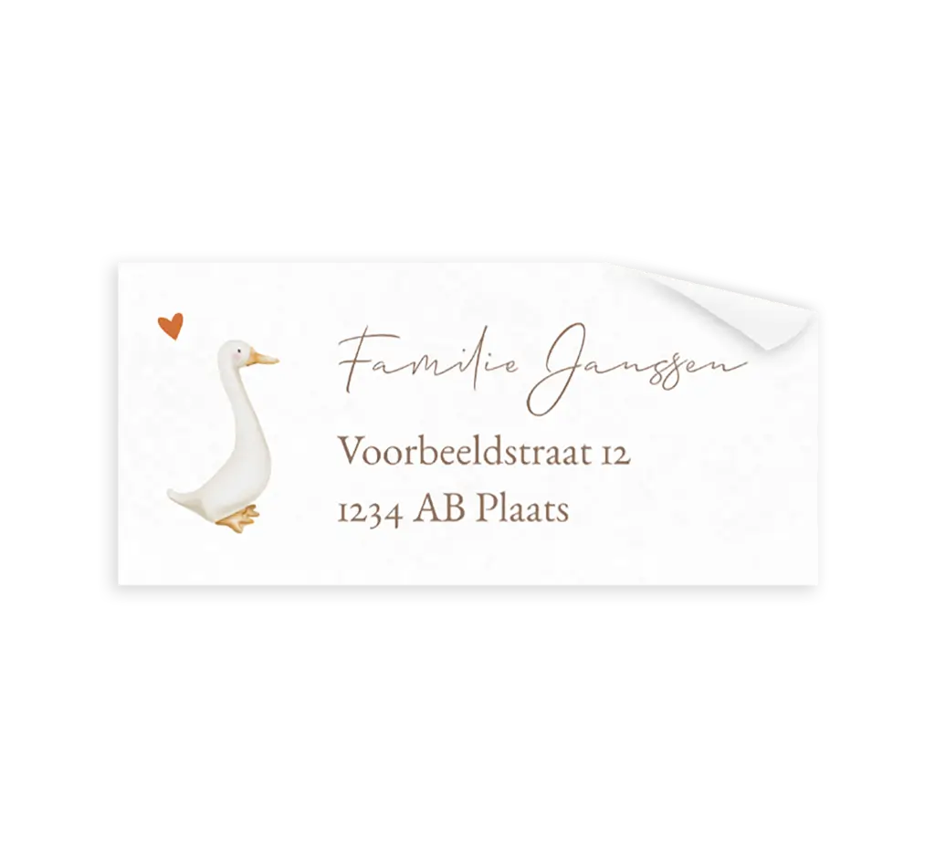 Verzend de geboortekaartjes in stijl met deze adresstickers! Op de adressticker staat de illustratie van een gans met klein hartje. De adresstickers zijn naar wens aan te passen in onze online editor.