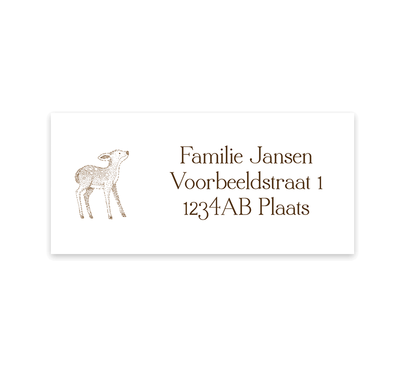 Verstuur jullie geboortekaartjes met deze bijpassende adreslabels, zo heb je een mooi geheel! Naast de tekst staat een lief hertje. Pas de adressen aan in de online editor en bestel.