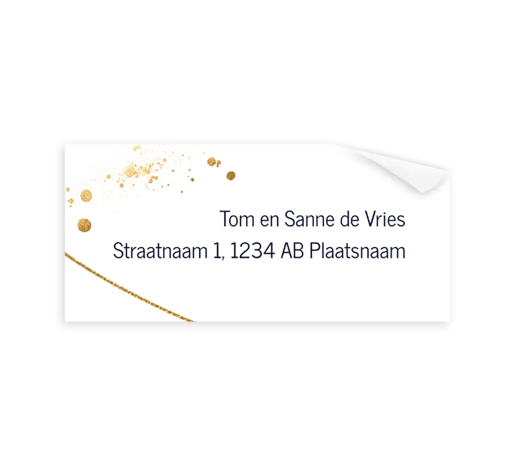 Een lieve adressticker met witte achtergrond en verschillende goudlook elementen. In het midden is er ruimte voor het adres. De adresstickers kan je naar wens aanpassen in de editor.