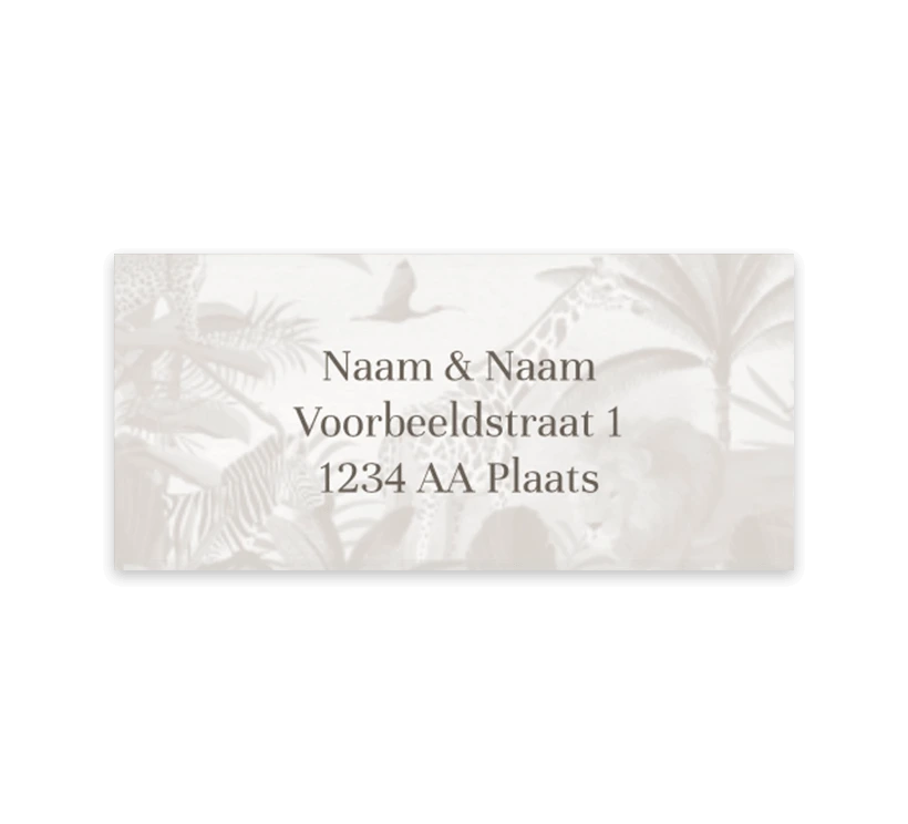Deze adresstickers hebben een grijze kleur en jungle thema. Het ontwerp van de stickers kan helemaal naar wens aangepast worden in onze online editor. Ook kunnen daar de juiste adressen ingevuld worden.