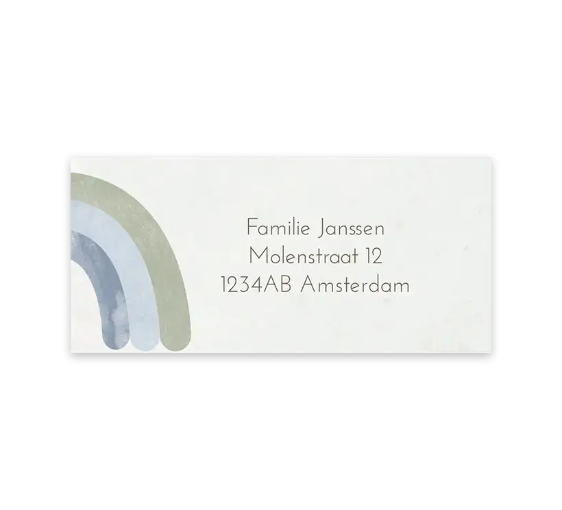 Deze adresstickers hebben een lichtgroene achtergrond met regenboog in blauw- en groentinten. In onze online editor kan op iedere sticker een ander adres ingevuld worden. Ook kan het design van de stickers helemaal aangepast worden naar eigen wens.