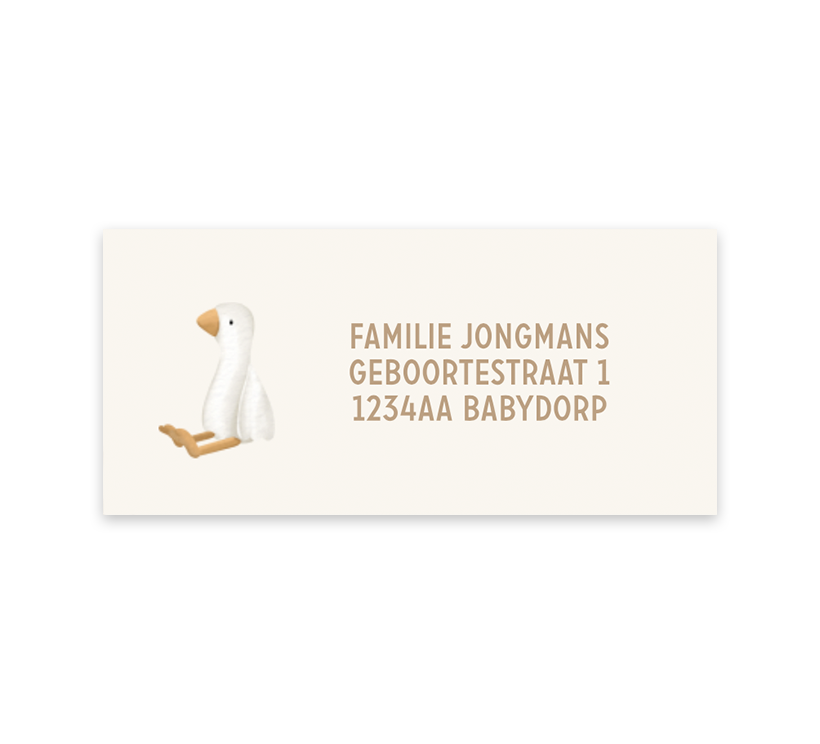 Stijvolle en lieve adresstickers met crème achtergrond. Aan de linkerkant van de adresstickers zit een lieve gansje. Pas de adressen aan in onze online editor en bestel de adresstickers voor jouw geboorteaankondiging.