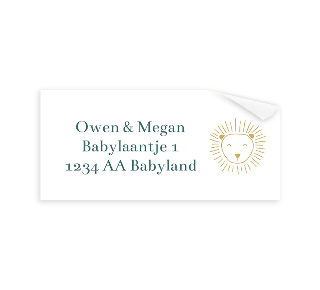 Een bijpassende adressticker voor op de envelop. De letters zijn groen en het leeuwtje wordt gedrukt in goudkleur. Pas het ontwerp naar wens zelf aan.