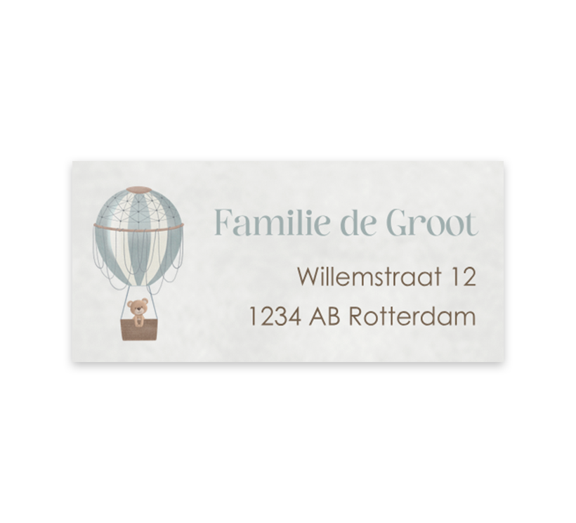 Bijpassende adressticker bij het geboortekaartje met het beertje in de gestreepte luchtballon. In onze online editor kan op iedere sticker een ander adres ingevuld worden. Ieder vel bevat twaalf adresstickers.
