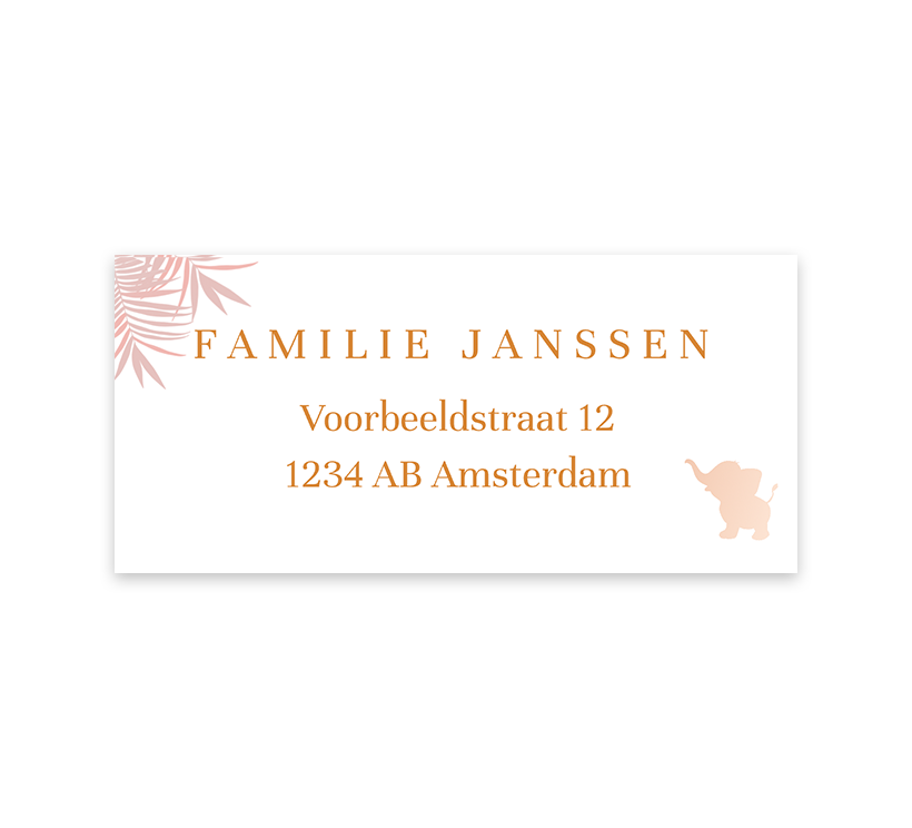 Handige adresstickers bij het zachtroze hippe geboortekaartje. In de hoek een roze palmblad, het olifantje naast de adressen is ook in roségoudfolie. In de online editor kun je 12 adressen per vel invoeren.