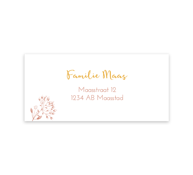 Bijpassende adresstickers bij het roze aquarel geboortekaartje voor een zusje. In de hoek het silhouet van een roze bloem, de adressen kunnen worden aangepast in de online editor.
