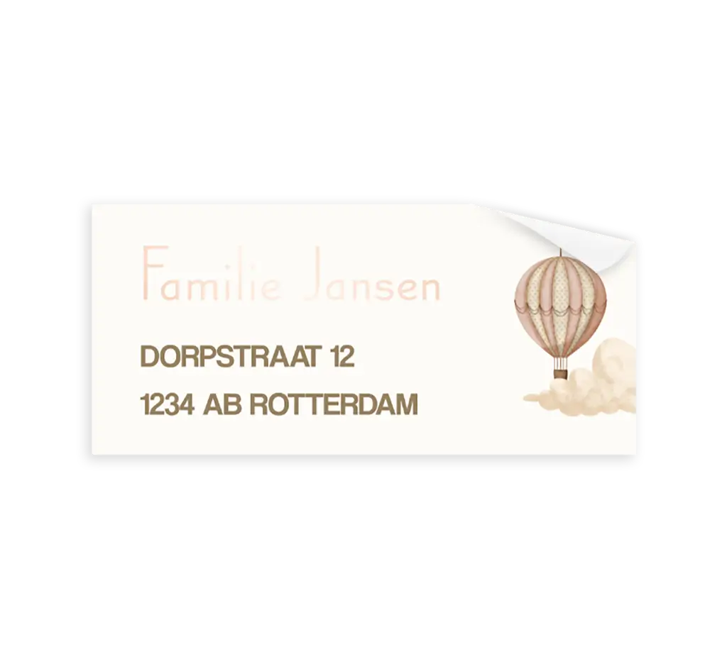 Verstuur jullie geboortekaartje in stijl met deze bijpassende adresstickers. Aan de rechterkant staat de luchtballon in roze, een deel van de tekst staat in roségoudfolie. Per vel kun je 12 adressen invoeren in onze online editor.