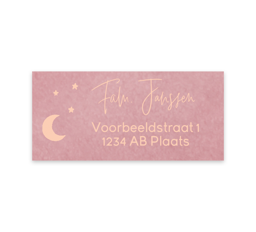Deze adresstickers zijn super handig voor het versturen van de geboortekaartjes. De stickers hebben een roze velvet-look achtergrond met maan en sterren. De stickers zijn helemaal naar wens aan te passen in onze online editor.