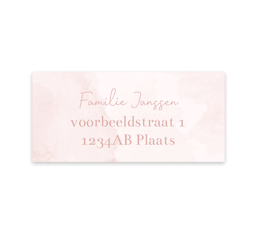 Deze adresstickers hebben een lichtroze achtergrond met watercolour. Het ontwerp van de stickers kan helemaal naar wens aangepast worden in onze online editor. Ook kunnen daar de juiste adressen ingevuld worden.