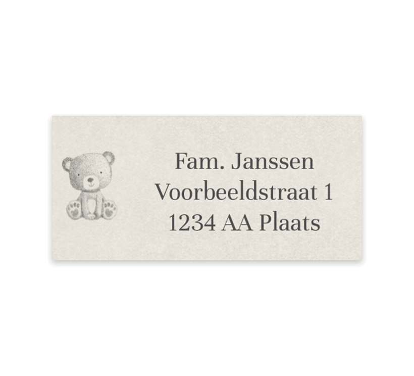 Stijvolle en lieve adresstickers met beige achtergrond. Aan de linkerkant van de adresstickers staat een lieve getekend beertje. Pas de adressen aan in onze online editor en bestel de adresstickers voor jouw geboorteaankondiging.