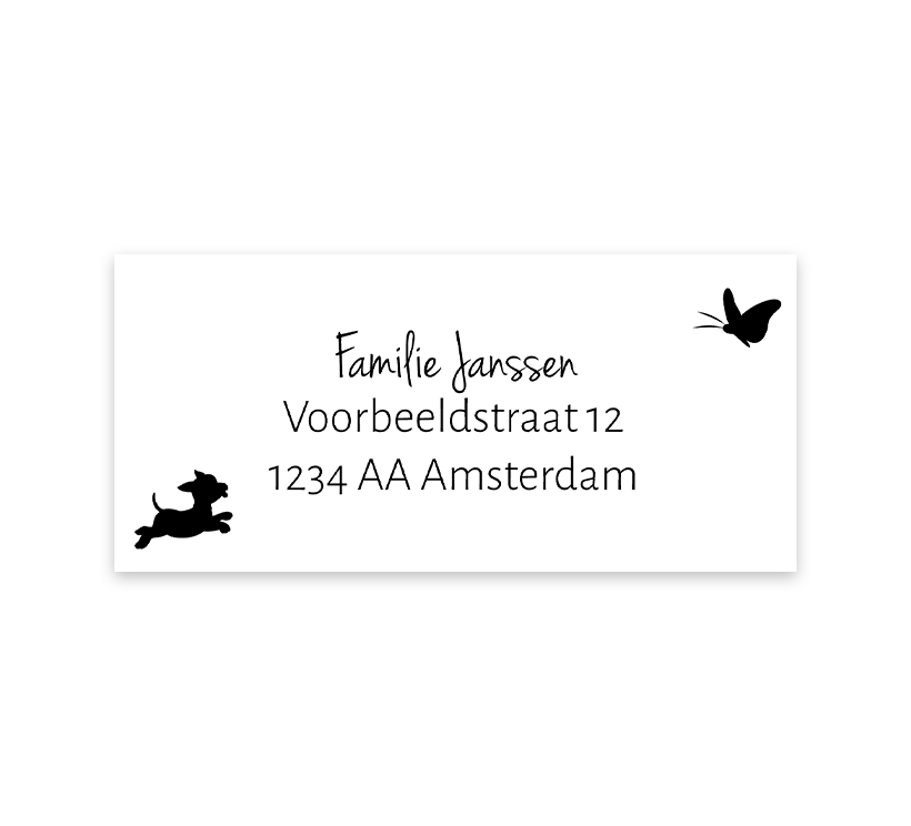 Mooie bijpassende adresstickers bij het kraftlook geboortekaartje van jullie dochter met een leuke illustratie met vlindertje en een rennend hondje. Op de witte sticker staat de tekst in zwart, per vel kunnen 12 adressen worden ingevoerd in de online editor.