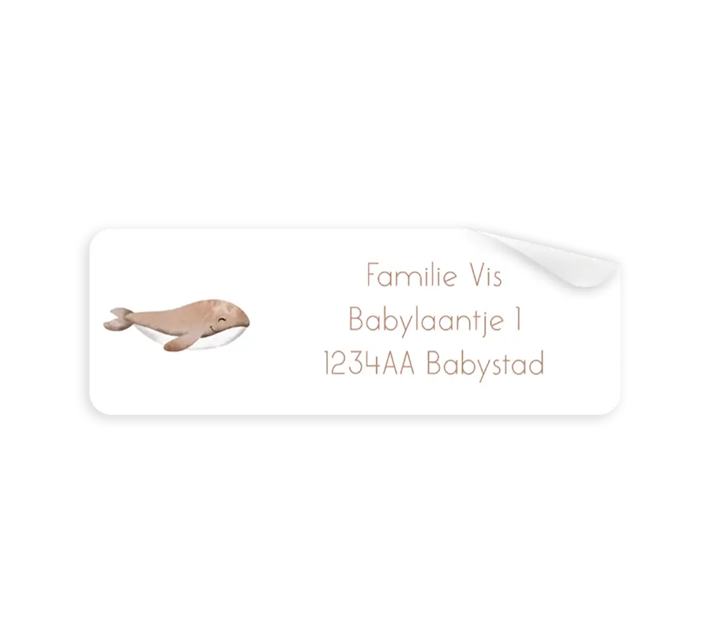 Een lieve adressticker passend bij het geboortekaartje. De sticker heeft een schattige illustratie van een beige walvis. Pas het ontwerp naar wens aan in onze online editor.