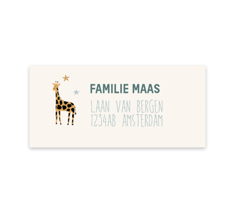 Een vrolijke adressticker voor jouw geboortekaartje. De sticker heeft een lieve illustratie van een giraffe omringd door sterretjes. Vul zelf de adressen in en maak het verzenden nog makkelijker.