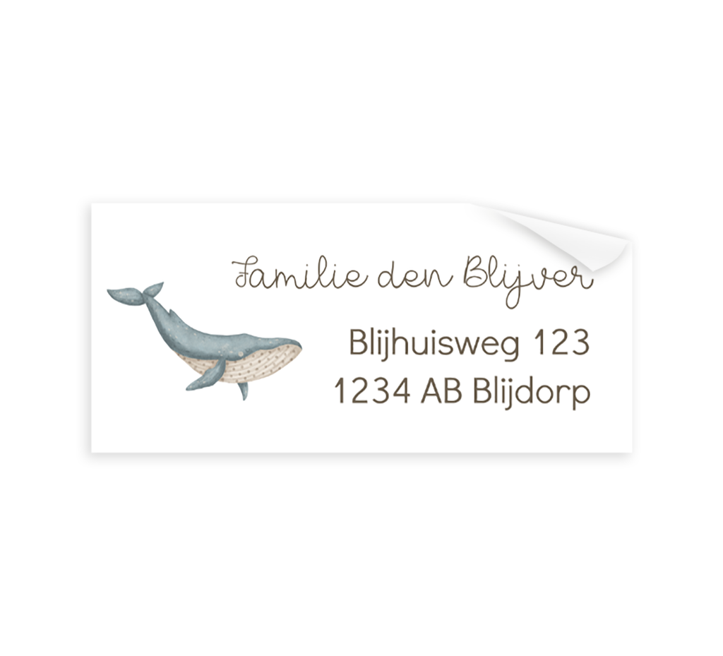 Het versturen van de geboortekaartjes wordt een feestje met deze adresstickers. Naast het adres staat de illustratie van een walvis. De stickers zijn helemaal naar wens aan te passen in onze online editor.