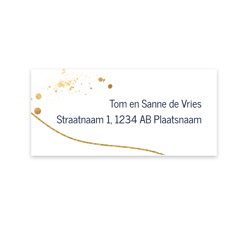 Een lieve adressticker met witte achtergrond en verschillende goudlook elementen. In het midden is er ruimte voor het adres. De adresstickers kan je naar wens aanpassen in de editor. Op ieder vel zitten 12 adresstickers.