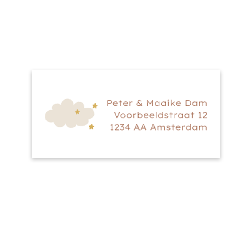 Een lieve adressticker passend bij jouw geboortekaartje. De stickers hebben een witte achtergrond met daarop een lief wolkje met sterretjes. Pas de adressen op de sticker aan via onze online editor. Op ieder vel zitten 12 adresstickers.