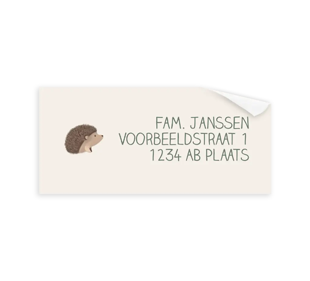 Een lieve adressticker voor op de envelop. De sticker heeft een beige achtergrond. Daarnaast zie je een lieve illustratie van een egeltje. Pas de sticker naar wens zelf aan.