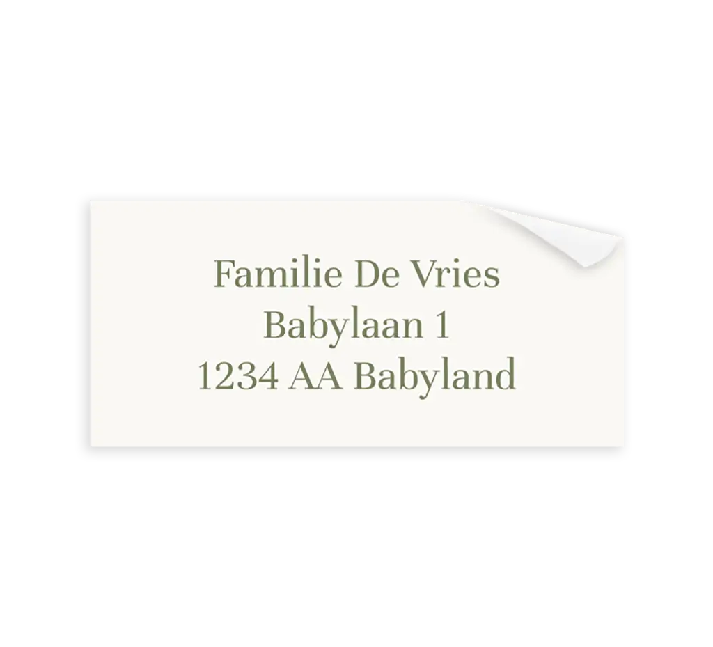Bijpassende adressticker bij het geboortekaartje van jouw kindje. Deze sticker heeft een gebroken witte achtergrond, met groene typografie. Pas de adressen zelf gemakkelijk aan.