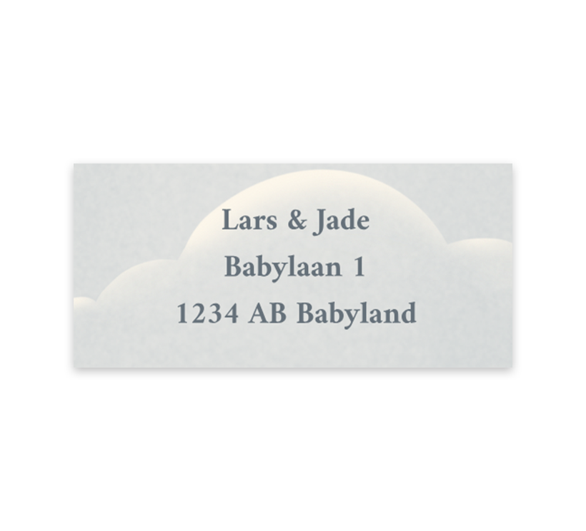 Een stijlvolle adressticker met blauwe achtergrond en wolkjes De adresstickers kan je naar wens aanpassen in de editor. Op ieder vel zitten 12 adresstickers.
