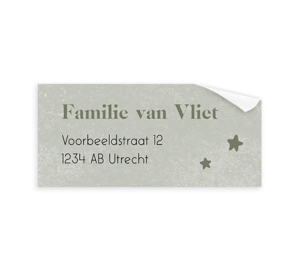 Deze adressticker past perfect bij jullie geboortekaartje. De stickers zijn voorzien van een groene achtergrond met sterretjes. In onze online editor kan op iedere sticker een ander adres ingevuld worden. Ieder vel bevat twaalf adresstickers.