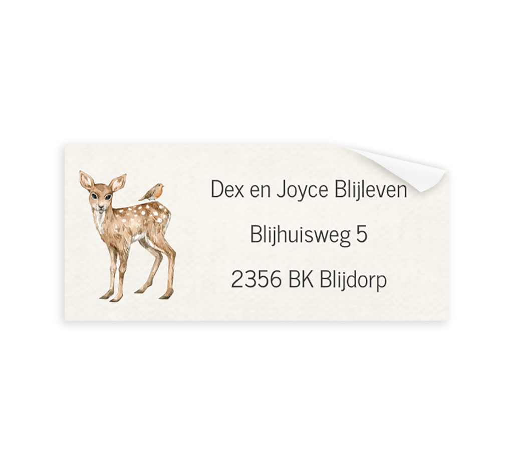 Het versturen van de geboortekaartjes wordt een feestje met deze adresstickers! Op de stickers lees je het adres en zie je een getekend hertje. De stickers kunnen naar wens aangepast worden in onze online editor.