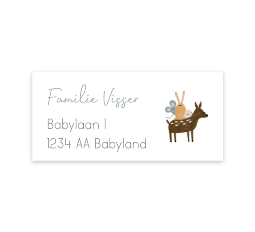 Met deze bijpassende adreslabels bij je geboortekaartje maak je er een unieke geboorteaankondiging van. Op de adressticker staan naast het adres lieve getekende diertjes. In de online editor vul je per label het juiste adres in. Elk vel bevat 12 stickers.
