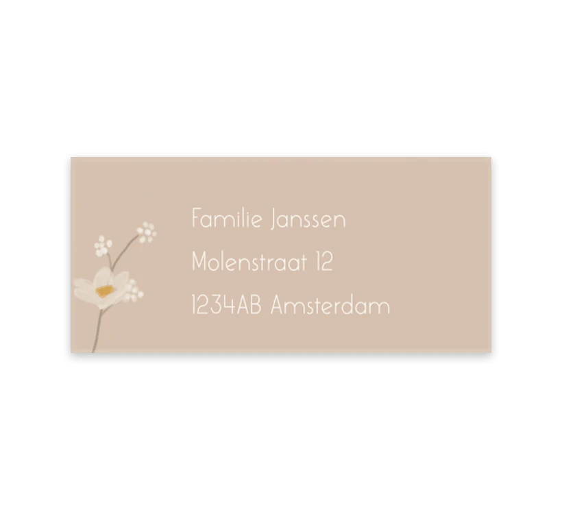 Stijvolle adresstickers met een beige achtergrond. Naast de adressen staan lieve bloemetjes. Pas de adressen en het ontwerp naar wens aan in onze online editor en bestel de adresstickers voor jouw geboorteaankondiging.