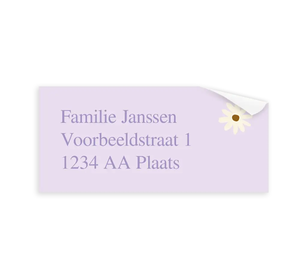 Deze adresstickers hebben een lila achtergrond, met witte madeliefjes en passen perfect bij het geboortekaartje. In onze online editor kan op iedere sticker een ander adres ingevuld worden. Ook kan het design van de stickers helemaal aangepast worden naar eigen wens.