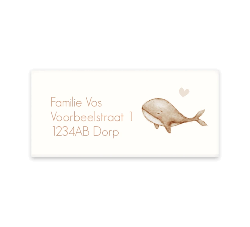 Verzend de geboortekaartjes in stijl met deze adresstickers. De stickers hebben een lichte achtergrond met de watercolour illustratie van een walvis. Het kleine hartje geeft deze stickers een lieve uitstraling. De adresstickers zijn helemaal naar wens aan te passen in onze online editor.