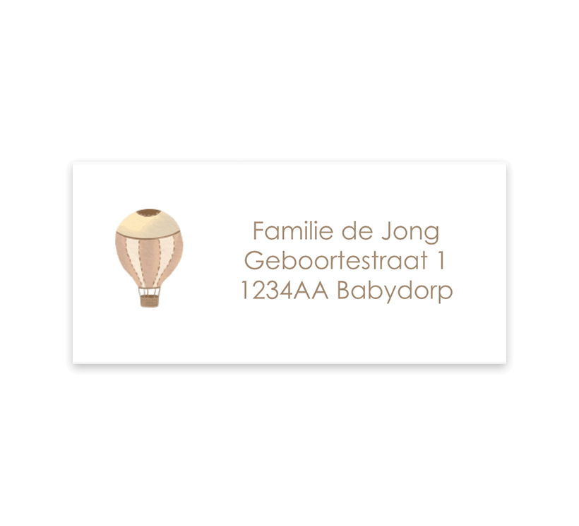 Een lieve adressticker met witte achtergrond en een illustratie van een luchtballon. Maak er een mooi geheel van in combinatie met het geboortekaartje. De adresstickers kan je naar wens aanpassen in de editor.