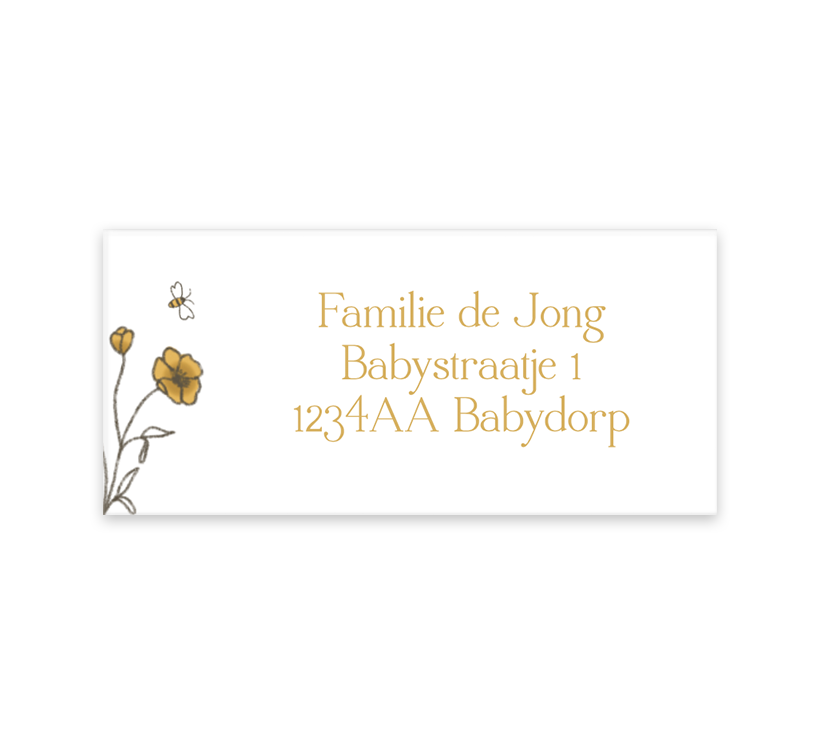 Vrolijke adresstickers met bloemetjes. De tekst staat in goud op een witte achtergrond, in de editor kun je per vel 12 adressen invoeren.